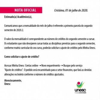 Os interessados podem fazer a inscrição até o dia 19 de setembro pelo link www.unesc.net/inscricao/mobilidadeacademica, sendo obrigatório o preenchimento correto do formulário. A homologação preliminar será disponibilizada no dia 21 de setembro pelo site www.unesc.net.