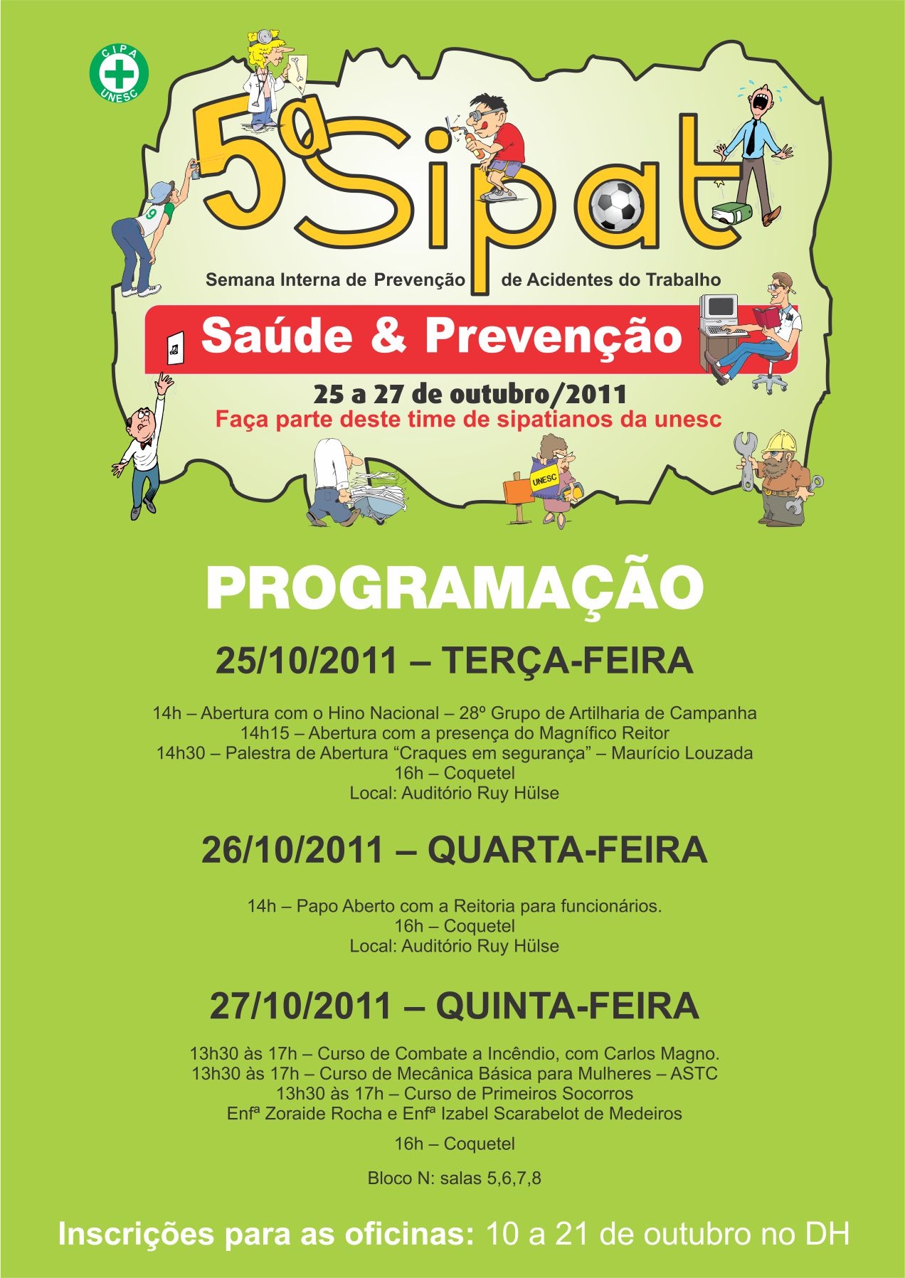 Curso de combate a incêndio, de mecânica básica para mulheres, de primeiros socorros, além do Papo Aberto com a Reitoria, fazem parte da programação. O Papo Aberto é um espaço em que professores, funcionários e acadêmicos podem dialogar, opinar, sugerir, criticar, propor, debater, reivindicar, fundamentar, conversar ou simplesmente ouvir os projetos e ações que estão sendo encaminhados pela Reitoria.