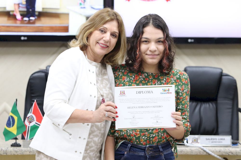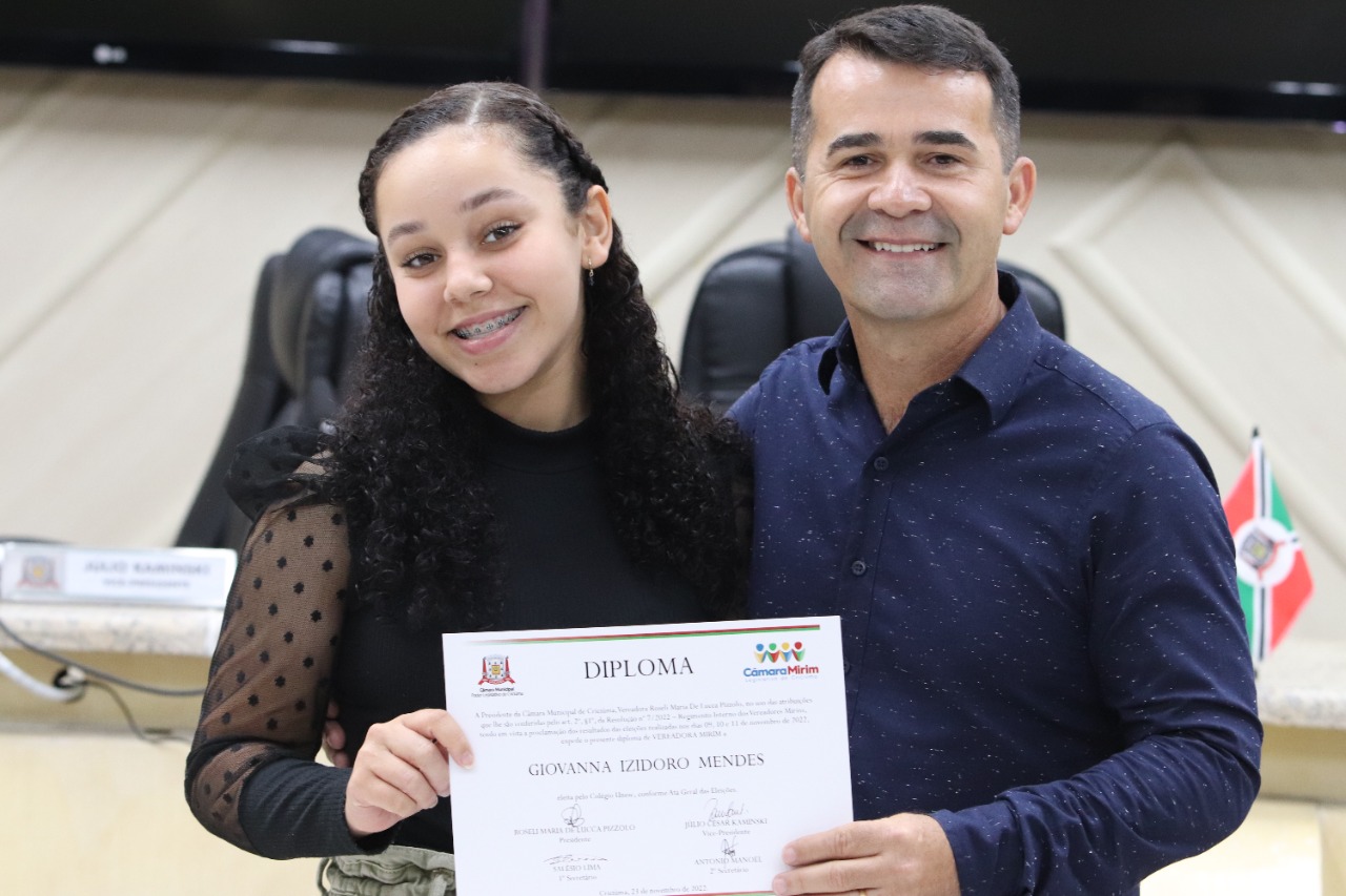 As vereadoras mirins, Giovanna Isidoro Mendes e Helena Ferrazzo Outeiro do Colégio Unesc foram diplomadas em cerimônia realizada no plenário da Câmara Municipal de Criciúma, na última semana.