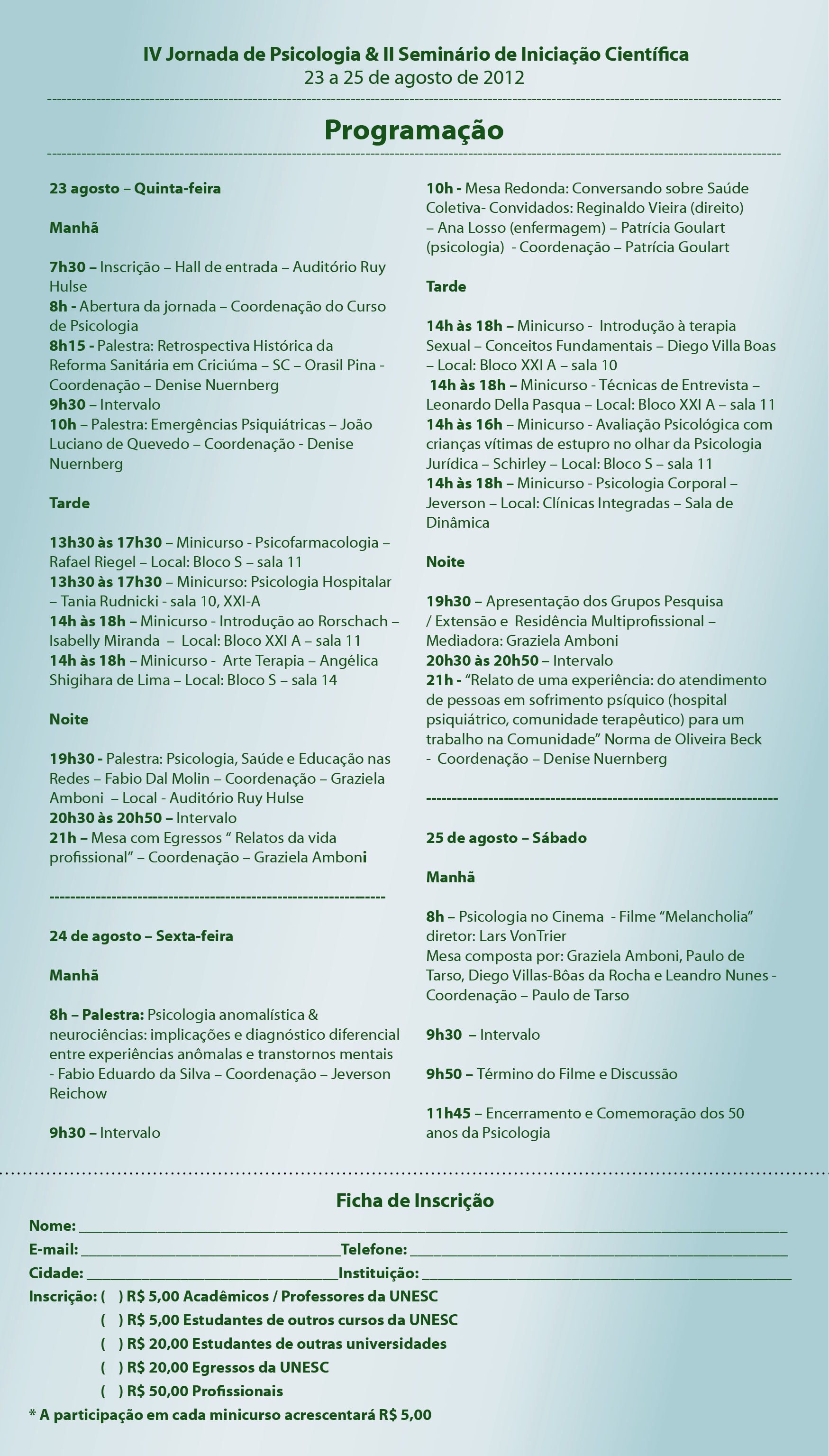 A Jornada inicia no dia 23, às 8 horas, com a palestra “Retrospectiva Histórica da Reforma Sanitária em Criciúma – SC”, ministrada por Orasil Pina. Além de palestras, o evento conta com minicursos, mesa-redonda, apresentações de trabalhos e relatos de experiências. Durante os três dias serão abordados temas como “Emergências Psiquiátricas”, “Psicologia Hospitalar”, “Psicologia Corporal” e “Introdução à terapia Sexual”. A Jornada também vai comemorar os 50 anos da Psicologia no Brasil.