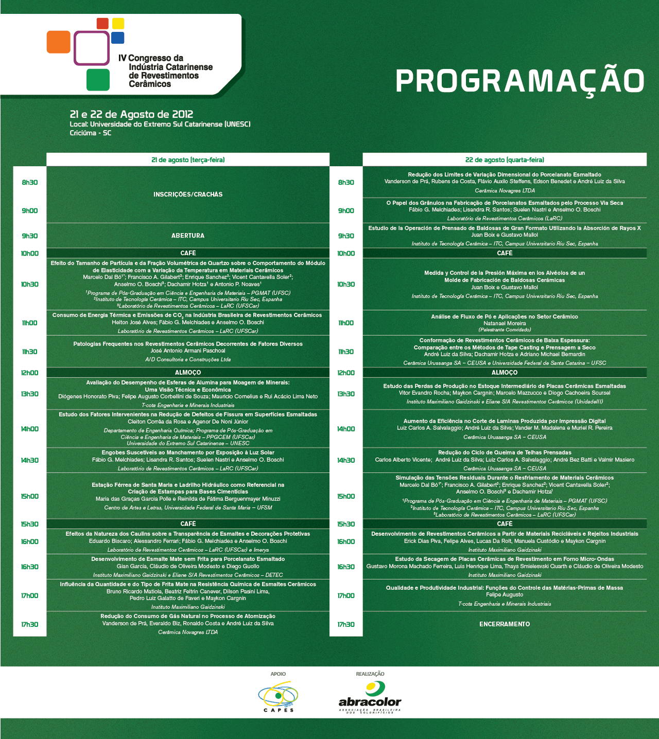 “Ao longo dos anos a Abracolor vem apoiando eventos que promovem a troca de experiências e de conhecimento em tecnologia cerâmica”, destacou o presidente da Associação, Francisco de Assis Abreu. Também participou da abertura do congresso o curador do evento e professor da UFSCar Anselmo Ortega Boschi.