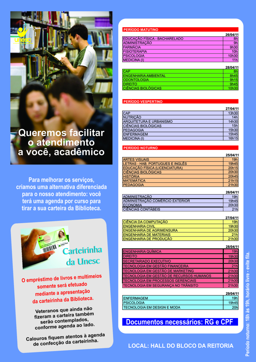 Estudantes que ingressaram na Unesc no primeiro semestre de 2011 vão participar de uma campanha para a confecção da carteirinha da Biblioteca na próxima semana, de segunda a sexta-feira (dias 25 a 29/4). Para agilizar o atendimento no hall do Bloco da Reitoria, foi montado um cronograma por curso, data e horário. RG e CPF são os documentos necessários à confecção da carteirinha, imprescindível para o empréstimo de livros.