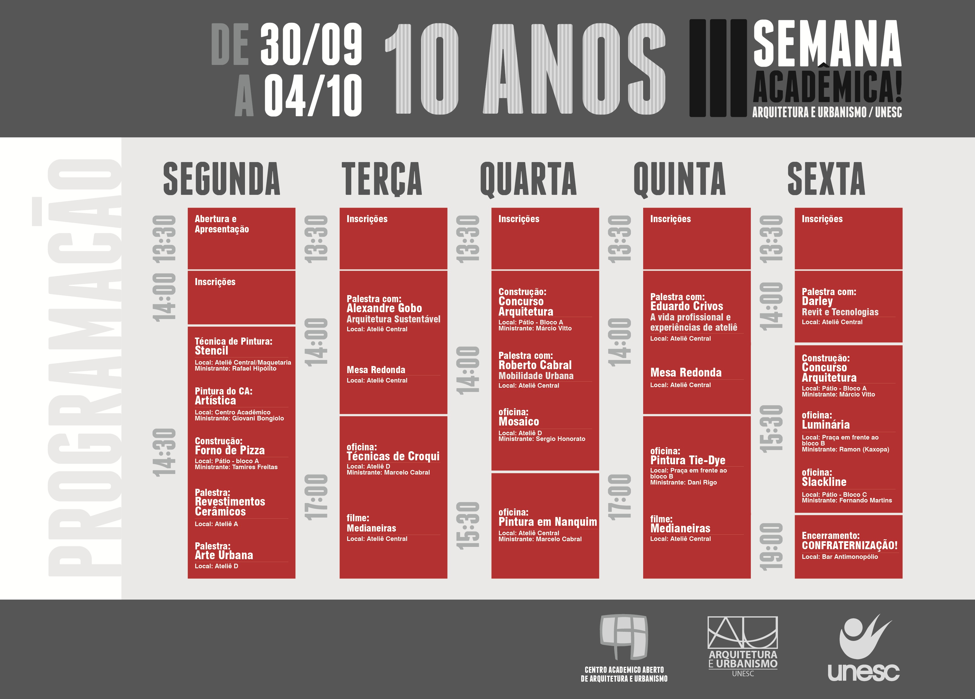 A Semana iniciou na tarde de ontem (30/9), com dois ingredientes especiais. O evento comemora os dez anos do curso e é o primeiro do gênero que ocorre no Estado desde que o CAU (Conselho de Arquitetura e Urbanismo de Santa Catarina) foi criado, há 20 meses.