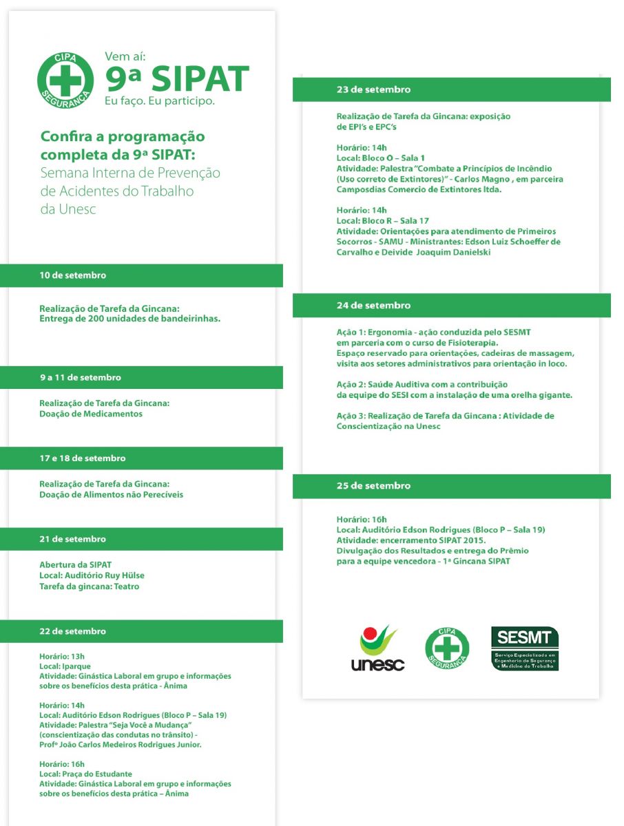 Com o intuito de conscientizar o colaborador quanto à importância da prevenção de acidentes e doenças no ambiente do trabalho, promovendo a qualidade de vida, a Unesc realiza a a 9ª Sipat (Semana Interna de Prevenção de Acidentes do Trabalho). O evento vai contar com palestras, debates e uma gincana com equipes formadas por professores, funcionários e estagiários.
