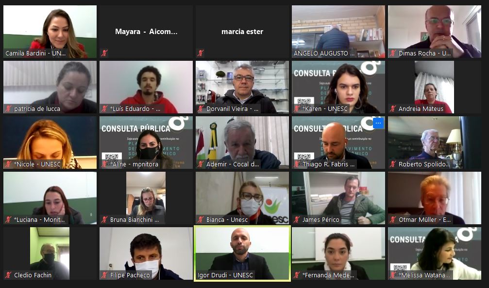 Na ação realizada em sala virtual nesta tarde a equipe da Unesc comandou o grupo de forma a estimular a participação de todos no apontamento de desafios, potencialidades e sonhos para Cocal do Sul. Em diferentes momentos, divididos em grupos menores ou diante de toda a equipe, os participantes puderam contribuir com opiniões e pontos de vista que formaram já um primeiro documento que integra o projeto.