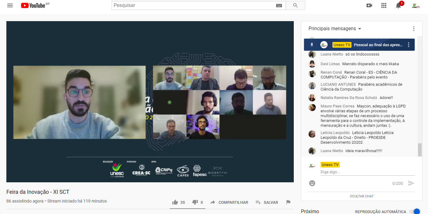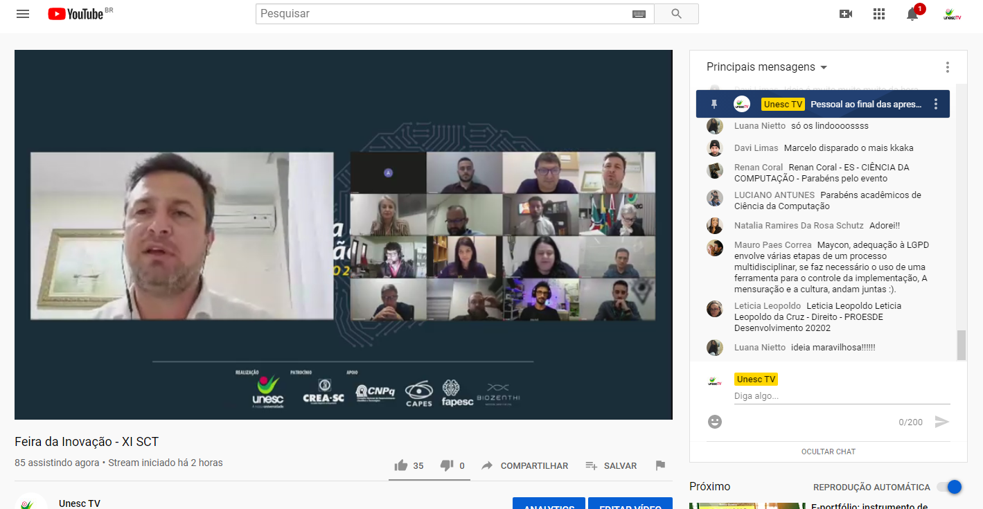 Após a troca de conhecimentos com os profissionais que são referência em inovação, foi a vez dos inscritos compartilharem suas soluções inovadoras para problemas reais e receberem as críticas construtivas e avaliações dos convidados. Com propostas nos mais diversos campos, para segurança pública, empreendedorismo, educação, meio ambiente e muito mais, a Feira já trouxe uma grande vitrine de espectadores na transmissão ao vivo da Unesc TV, por meio do canal no YouTube.