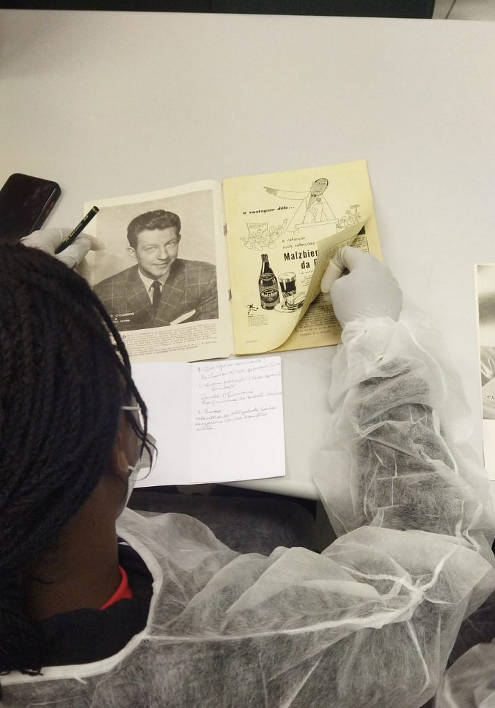 A professora ainda providenciou luvas, máscaras e aventais para garantir a segurança na manipulação dos documentos e os estudantes foram orientados sobre como utilizar carvão vegetal para produzir uma representação visual das informações coletadas.
