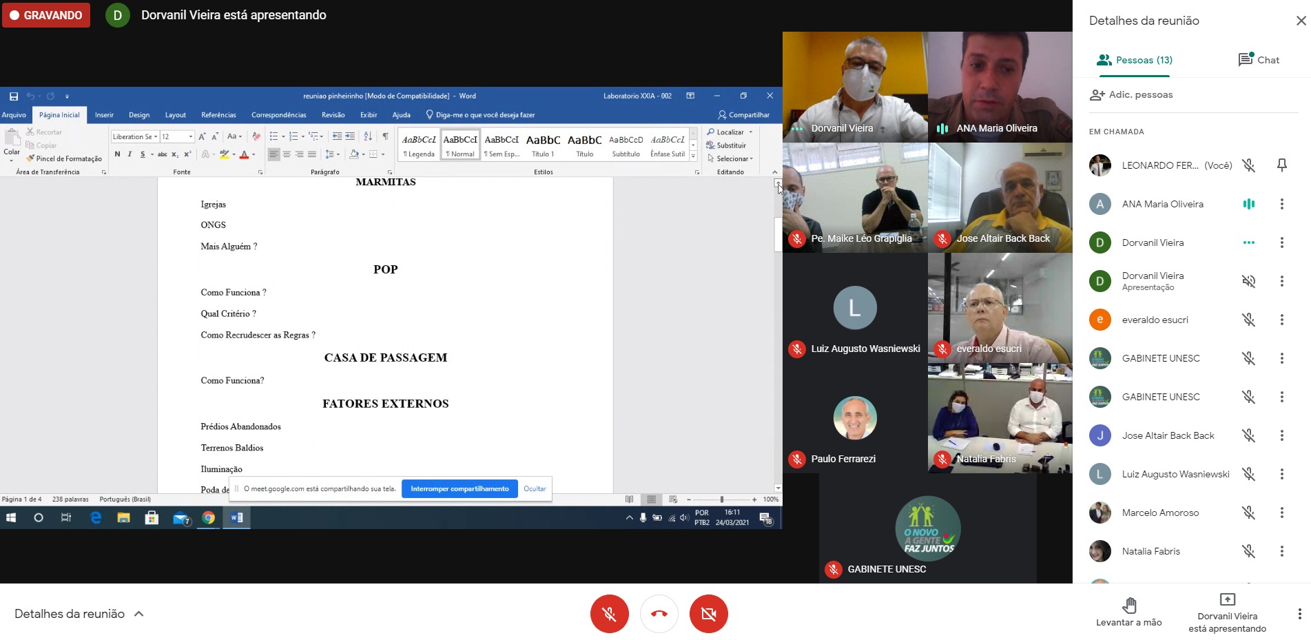 A tarde desta quarta-feira (24/3) foi marcada por mais um encontro de trabalhos do grupo “Pinheirinho em Ação”. O objetivo desta, que foi a terceira reunião, mais uma vez realizada de forma virtual, foi alinhar o planejamento e novas ações a serem executadas por cada uma das organizações e pessoas envolvidas. O momento foi conduzido pelo coordenador da Sala dos Municípios da Unesc, Dorvanil Vieira, e contou com a presença de instituições de ensino, lideranças comunitárias e políticas da região, moradores e empreendedores locais. O poder público também se fez presente.
