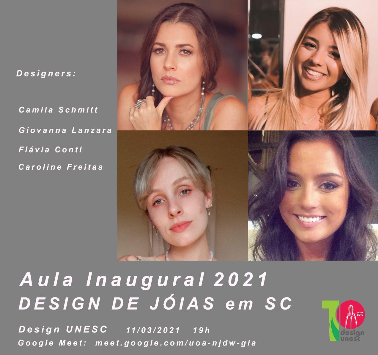 Um bate-papo sobre empreendedorismo, criatividade, protagonismo profissional e as possibilidades da área marcará o início do semestre no curso de Design - ênfase em projeto de produtos da Unesc. A “Aula Inaugural 2021: Design de Joias em Santa Catarina” reúne, a partir das 19 horas desta quinta-feira (11/3), quatro referências no segmento: Camila Schmitt, Giovanna Lanzara, Flávia Conti e Caroline Freitas.