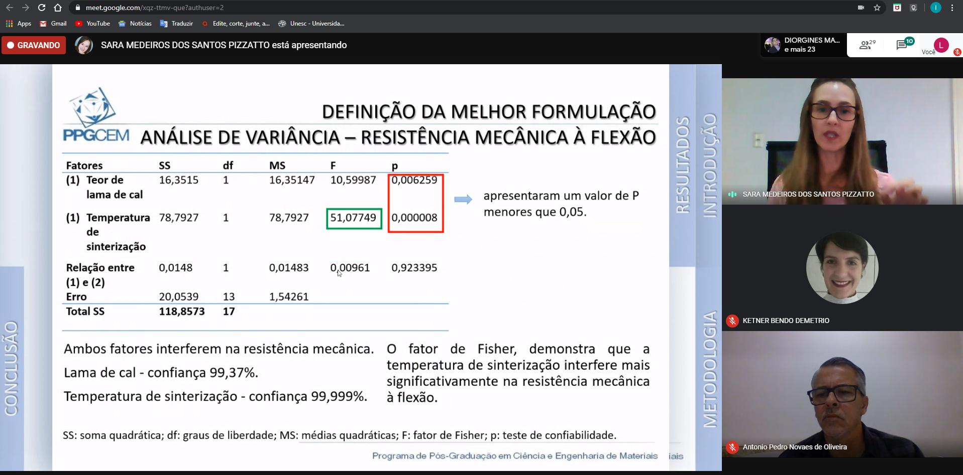 Durante defesa, a banca avaliadora se fez presente de lugares diferentes de Santa Catarina. Os professores doutores Antonio Pedro Novaes de Oliveira, do PGMAT (Programa de Pós-Graduação em Ciência e Engenharia de Materiais) e Fabiano Raupp-Pereira, do PPGCEM, acompanharam a apresentação de Florianópolis. Já a professora doutora Kétner Bendo Demétrio, também do Programa da Unesc, avaliou de Criciúma.