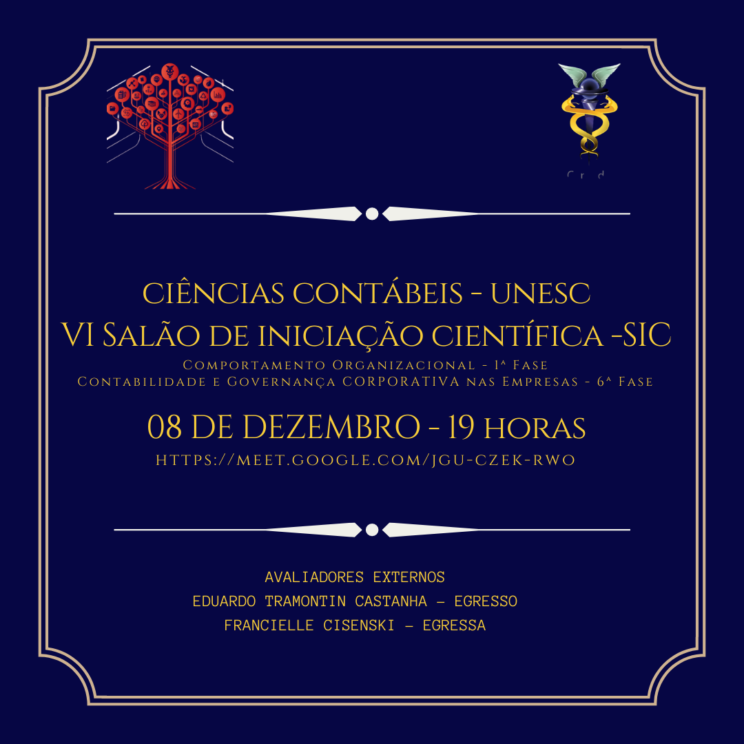 O curso de Ciências Contábeis da Unesc realizou no dia 8 de dezembro, a 6ª Edição do Salão de Iniciação Científica (SIC) integrado entre 1ª e 6ª fase do curso. Por conta da pandemia Covid-19, as apresentações dos estudantes e as respectivas exposições dos banners aconteceram de forma compartilhada pelo Google Meet.