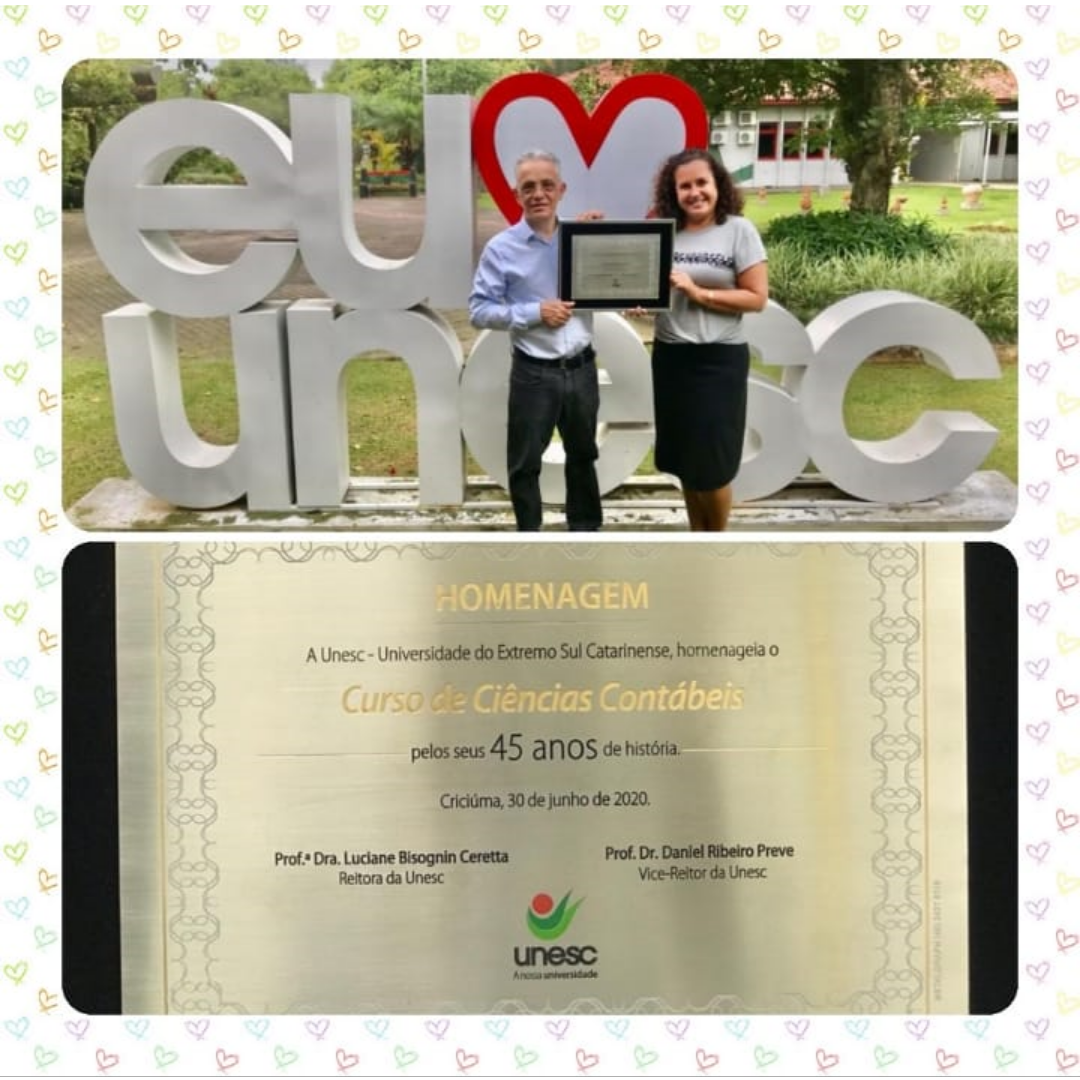A comunidade acadêmica e os coordenadores do curso agradecem a Reitoria pela homenagem da passagem dos 45 anos do Curso de Ciências Contábeis da Unesc. É um momento impar para o curso e essa homenagem é de todos os que fizeram parte dessa linda história de sucesso.