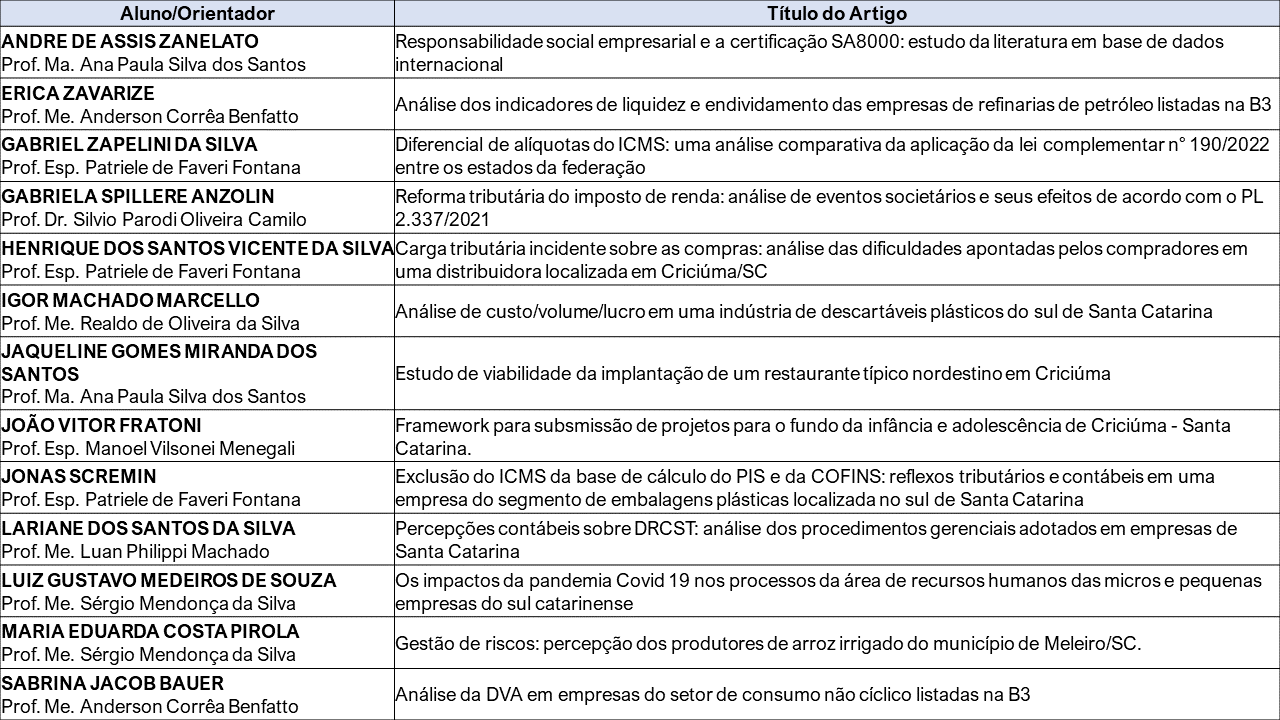 Aconteceu presencialmente entre os dias 5 e 8 de dezembro de 2022, as Bancas de TCC do Curso de Ciências Contábeis da Unesc. Os artigos científicos apresentados pelos estudantes da 9ª fase, contemplaram as áreas temáticas de Contabilidade Tributária, Auditoria, Perícia E Investigação Contábil, Contabilidade de Custos, Contabilidade Gerencial, Contabilidade Financeira, Formação E Exercício Profissional, Contabilidade Ambiental E Responsabilidade Social e Contabilidade Governamental.