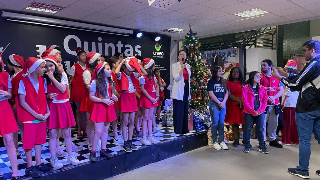 A celebração realizada no palco do Quintas Culturais no Bloco XXI, foi abrilhantada pelas crianças do Coral “Vozes da Esperança”, do Bairro, com as cantorias de músicas natalinas e com a presença do Papai Noel. Durante o evento foram distribuídos deliciosos picolés, doados por duas acadêmicas. A atividade tem a organização de toda a comunidade acadêmica, envolvendo professores, bolsistas, extensionistas, Centro Acadêmico (CA) e a Atlética “Caixa Forte”.
