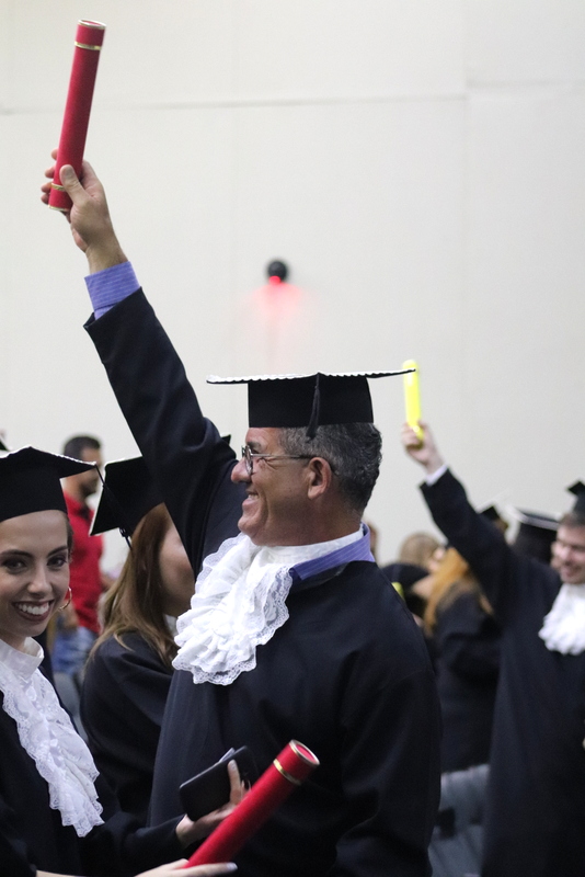 O que parecia um sonho para Gilmar Figueiredo, de 60 anos, se transformou em realidade na noite desta segunda-feira (10/2). Em pleno dia 10 de fevereiro de 2020, o Giba, como é conhecido na Unesc, deu mais um passo na direção do conhecimento: teve o grau outorgado em sua terceira graduação. O feito foi celebrado com a companheira, filhas, neta e amigos como a realização do sonho antigo de formar-se no curso de Direito para exercer a profissão de advogado. Assim como Gilberto, outros 50 acadêmicos da Unesc tornaram-se profissionais aptos a exercerem a profissão após a cerimônia de Colação de Grau Especial em gabinete nesta noite.