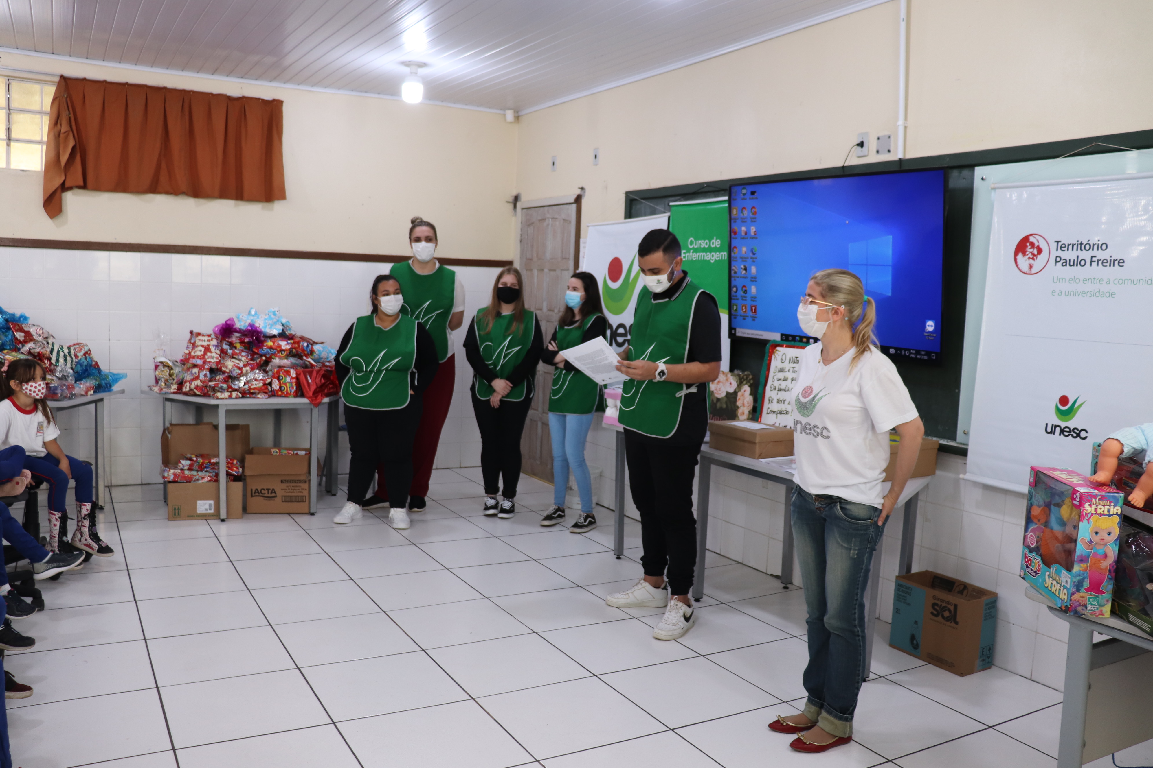 Para manter a tradição do projeto e encerrar as atividades do ano com chave de ouro, além de entregar materiais de educação em saúde foram realizadas na segunda (6/12) e na terça-feira (7/12) ações sociais de Natal para as crianças das escolas envolvidas no projeto. “Devido ao período pandêmico, no segundo semestre de 2021 o projeto segue realizando exclusivamente o seu Momento II, que corresponde às ações desenvolvidas por acadêmicos da segunda fase de graduação em Enfermagem”, pontua a coordenadora do projeto, professora Fabiane Ferraz.