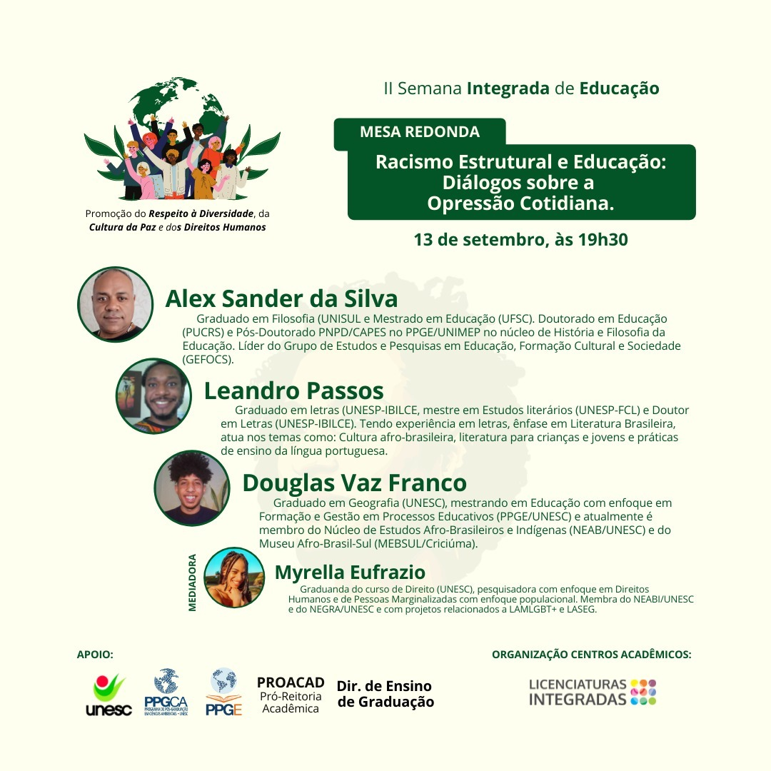 A Profa Dra Indianara, representando a reitoria e parabenizando os organizadores pelo envolvimento e protagonismo, enfatizou a importância da temática evidenciada, necessária, sobretudo em tempos atuais. Afirmou que, a temática dialoga com os valores da nossa Universidade. A Unesc tem em seus princípios e valores, a inclusão e a promoção da cultura de paz. Estão inclusos nas atividades e práticas voltadas as três dimensões acadêmicas: no ensino na pesquisa e na extensão. Citando, como exemplo, o NEAB, Secretaria de diversidade, Âmago, entre tantos programas institucionais que dialogam com essa temática, enfatizou a importância da temática em debate, que é transversal as áreas de conhecimento da Unesc.