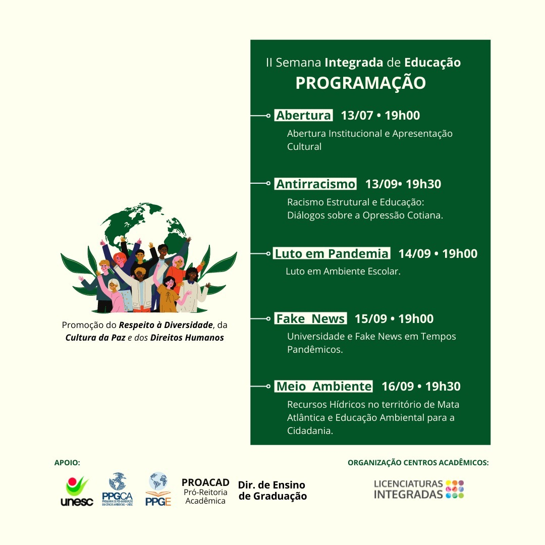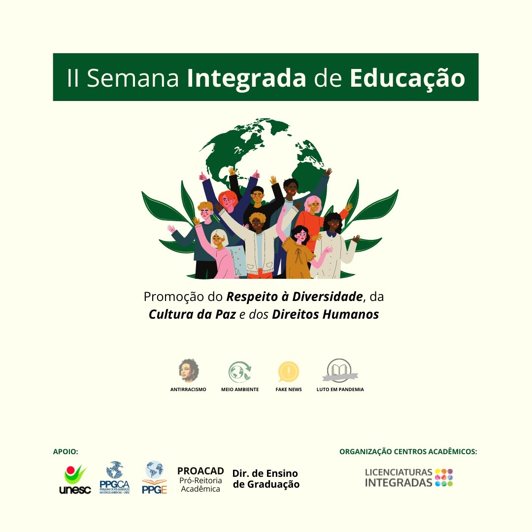 A II SEMANA INTEGRADA DE EDUCAÇÃO, promovida pelos cursos de Licenciatura da Unesc, com a coordenação dos estudantes, ocorre no período de 13 a 16 de setembro de 2021.