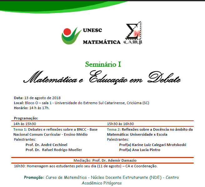Acadêmicos e Docentes do Curso de Matemática e convidados do Curso de Letras da Universidade do Extremo Sul Catarinense (UNESC), participaram hoje (13/08/2018) do Seminário I - Matemática e Educação em Debate