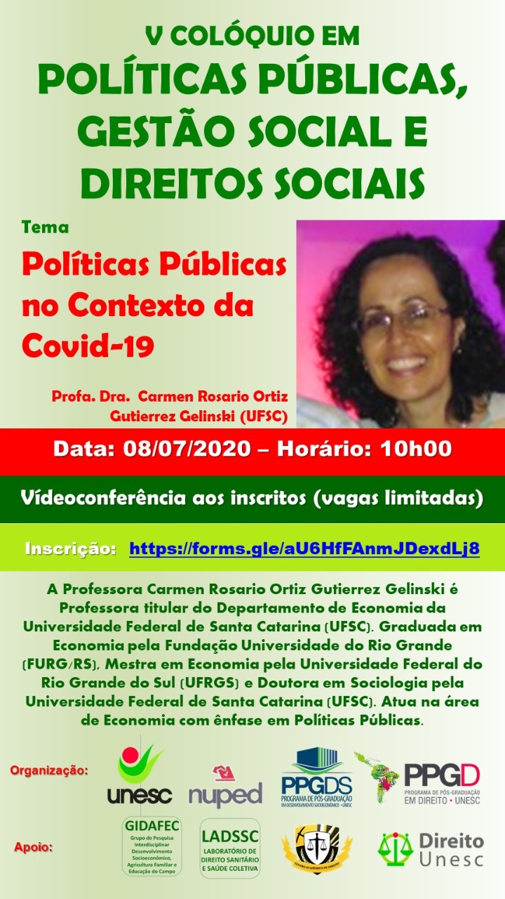 06 de julho de 2020 às 16:59[08/07] V COLÓQUIO EM POLÍTICAS PÚBLICAS, GESTÃO SOCIAL E DIREITOS SOCIAIS