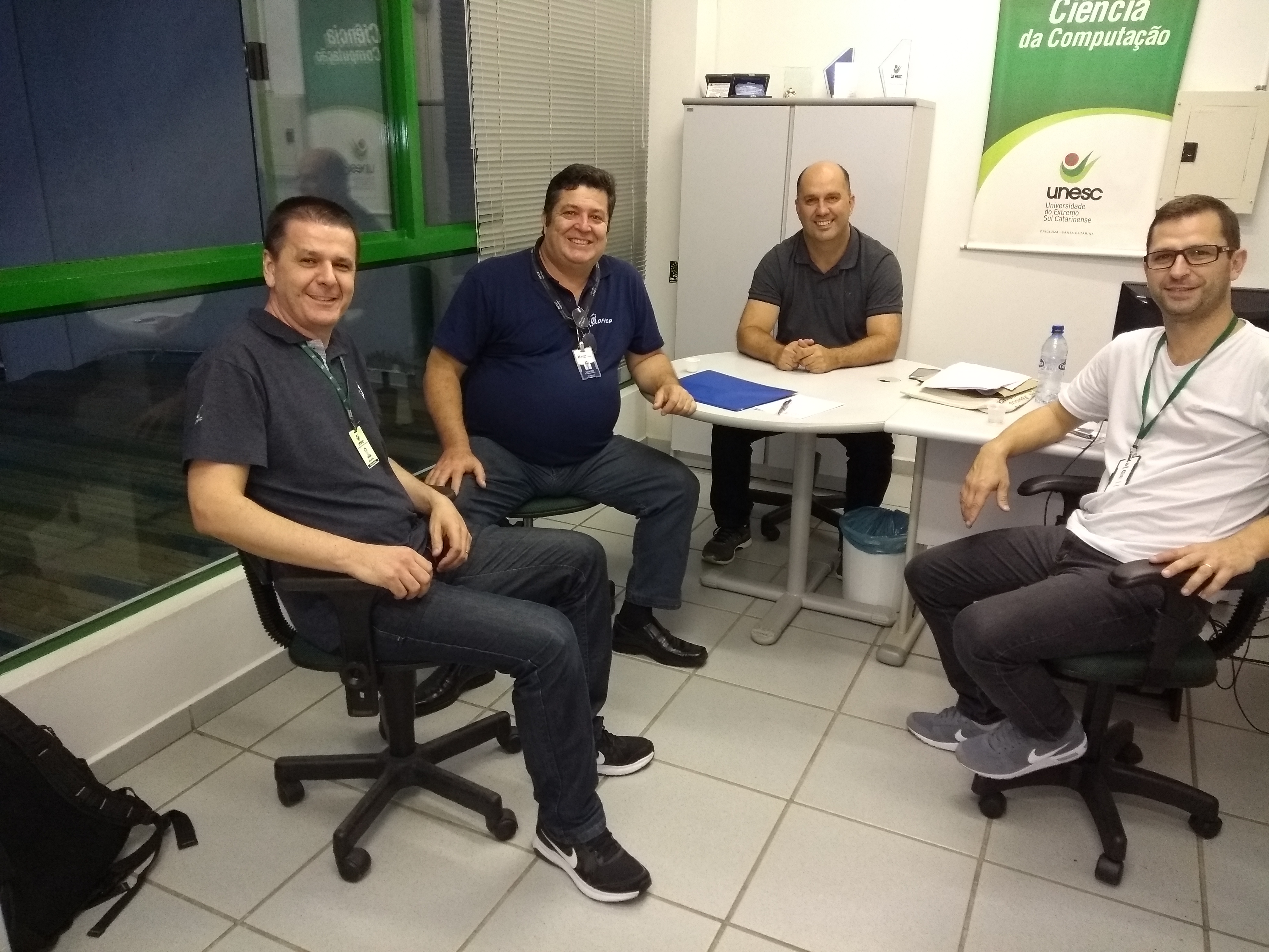 Na terça-feira dia 24/04/2018 a empresa V.OFFICE representada pelo gerente Marcos Fernando Mafra, esteve no departamento de Ciência da Computação da UNESC. Nessa reunião foram discutidas possibilidades de parceria entre essa empresa, o curso e o departamento de TI da Universidade. Estiveram presentes a professora Ana Claudia, os professores Luciano Antunes e Valter Blauth, além do funcionário do TI Adjano Scarmagnani. A V.OFFICE Redes e Telecomunicações está presente no mercado há mais de 20 anos, contando com profissionais altamente capacitados, desenvolvendo projetos inovadores e/ou apoiamos o cliente na sua implantação. A empresa oferece treinamentos dentro das tecnologias em que oferece serviços e também oferece treinamento na área de desenvolvimento.