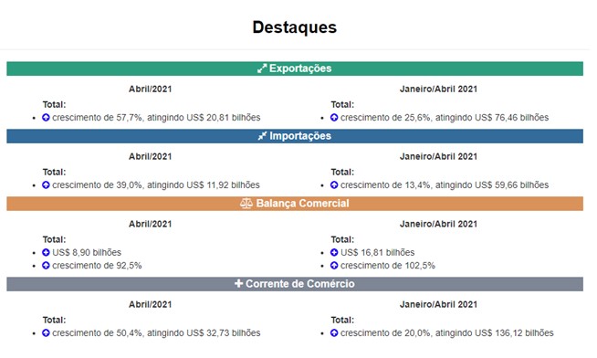 A balança comercial brasileira atingiu um superavit de US$ 16,81 bilhões no ano de 2021, valor este registrado até o final de abril. Apresentando então um crescimento de 102,5% pela média diária em relação ao período de janeiro a abril de 2020. Em paralelo, houve também um crescimento de 20% na corrente de comércio, atingindo US$ 136,12 bilhões. Sendo este total uma soma das exportações de US$ 76,46 bilhões, com alta de 25,6%, e as importações com 13,4% atingindo US$ 59,66 bilhões. Estes dados foram divulgados nesta segunda-feira (26/04) pela Secretaria de Comércio Exterior (Secex) do Ministério da Economia.