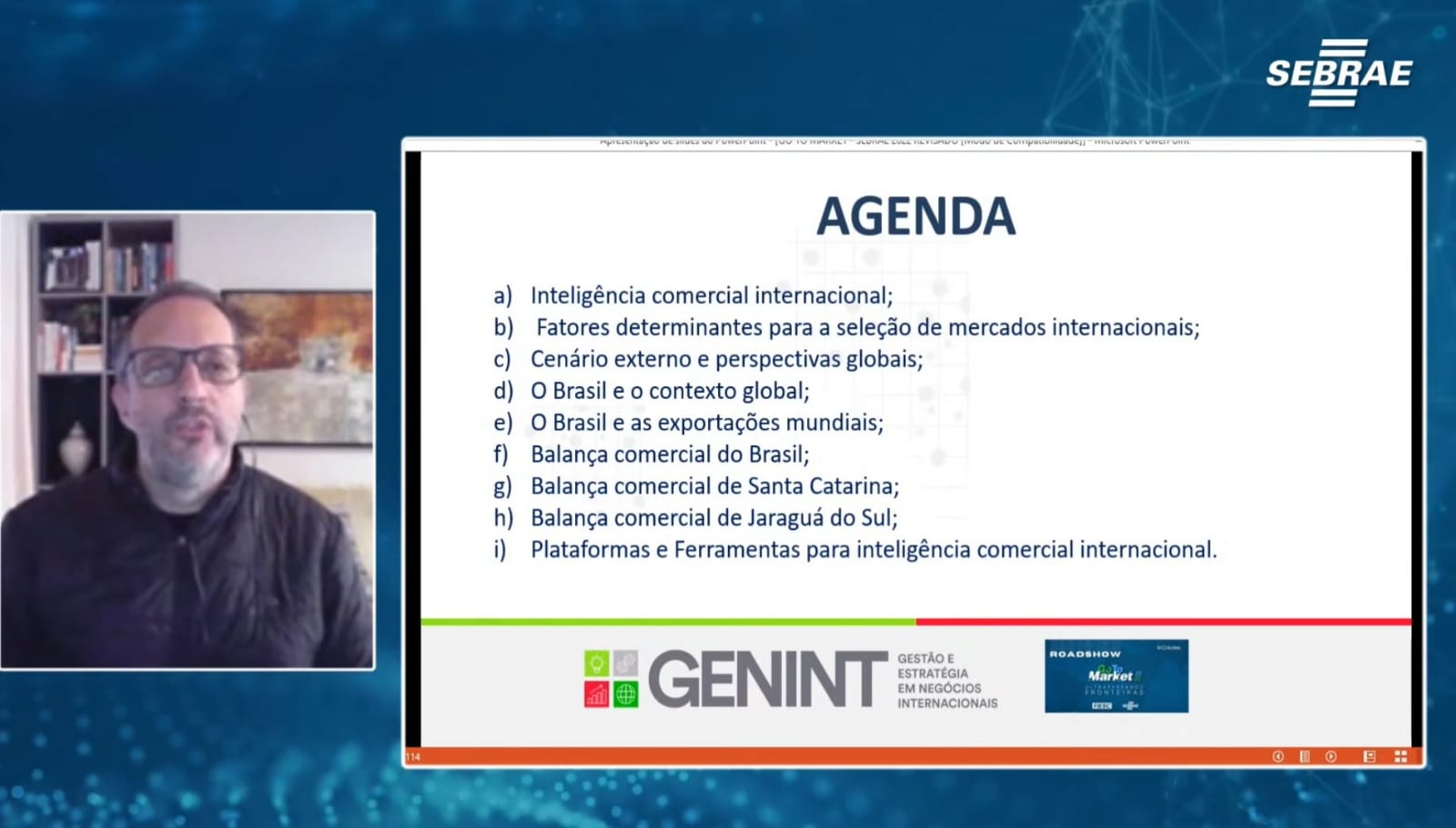 Na manhã desta quinta-feira (04.08.2022), os membros do Núcleo de Estudos Gestão e Estratégia em Negócios Internacionais - GENINT/UNESC, Prof. Dr. Júlio César Zilli e Profa. Janini Borba, ministraram uma palestra no Programa GO TO MARKET (SEBRAE SC/FIESC) envolvendo a temática "Técnicas e Inteligência Comercial Internacional". O evento ocorreu em Jaraguá do Sul-SC e os palestrantes estiveram presentes de forma remota.