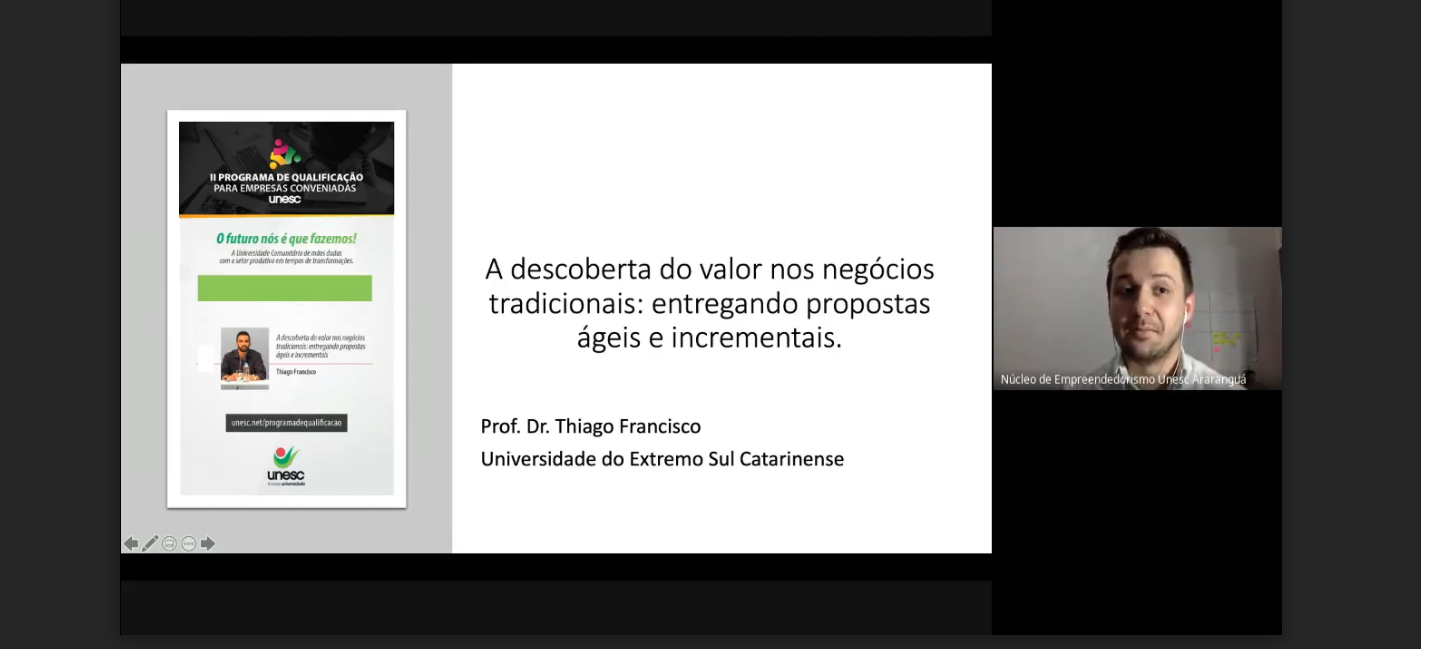 Durante a apresentação, o diálogo ficou aberto para os espectadores interagirem, via chat e participação em vídeo e áudio. Para quem não pode acompanhar o evento, a palestra “A descoberta do valor nos negócios tradicionais: entregando propostas ágeis e incrementais” também faz parte da programação do 2º Programa de Qualificação de Empresas Conveniadas da Unesc, e será ministrada na noite desta quinta-feira (23/7). Para saber mais acesse.