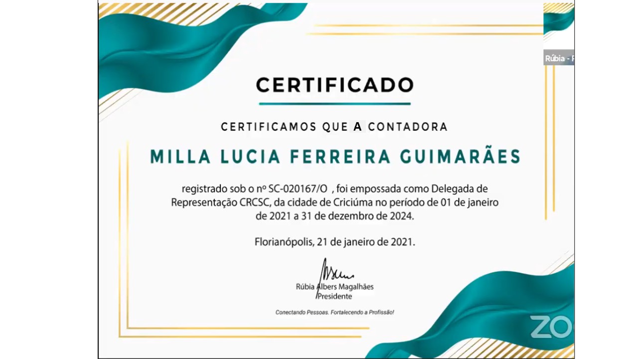 Hoje, 21 de janeiro de 2021, a coordenadora do Curso de Ciências Contábeis da Unesc, professora Milla Lúcia Ferreira Guimarães tomou posse como Delegada de Representação do Conselho Regional de Contabilidade de Santa Catarina para a Delegacia Regional de Criciúma. Desta Delegacia, fazem parte os municípios circunscritos, Balneário Rincão, Cocal do Sul, Criciúma, Forquilhinha, Içara, Morro da Fumaça, Nova Veneza, Siderópolis Treviso e Urussanga. A professora Milla explica que “as delegacias regionais visam a descentralização das atividades do CRCSC para maior eficiência no cumprimento de suas atribuições, especialmente quanto ao registro, fiscalização e atendimento aos contadores. Essa função é honorífica, portanto, não há vínculo empregatício. Será uma honra representar o CRCSC na região quando solicitado pela nossa presidente Rúbia Magalhães”.