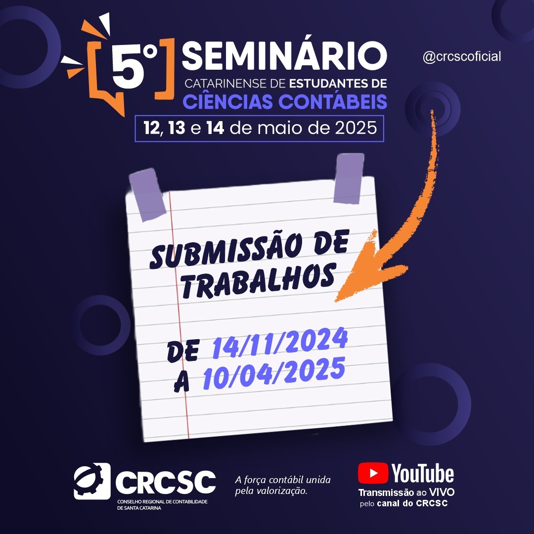 Nos dias 12, 13 e 14 de maio, de modo on line, acontecerá o 5º Seminário Catarinense de Estudantes de Ciências Contábeis.