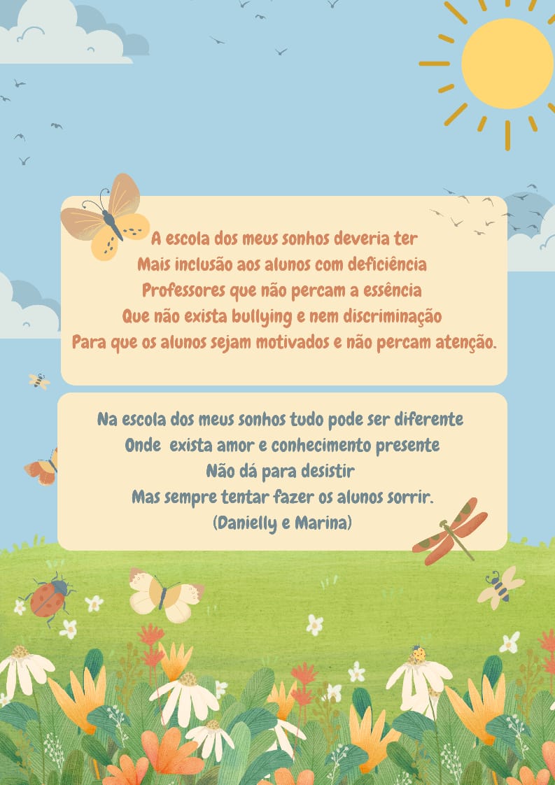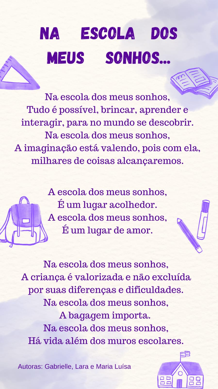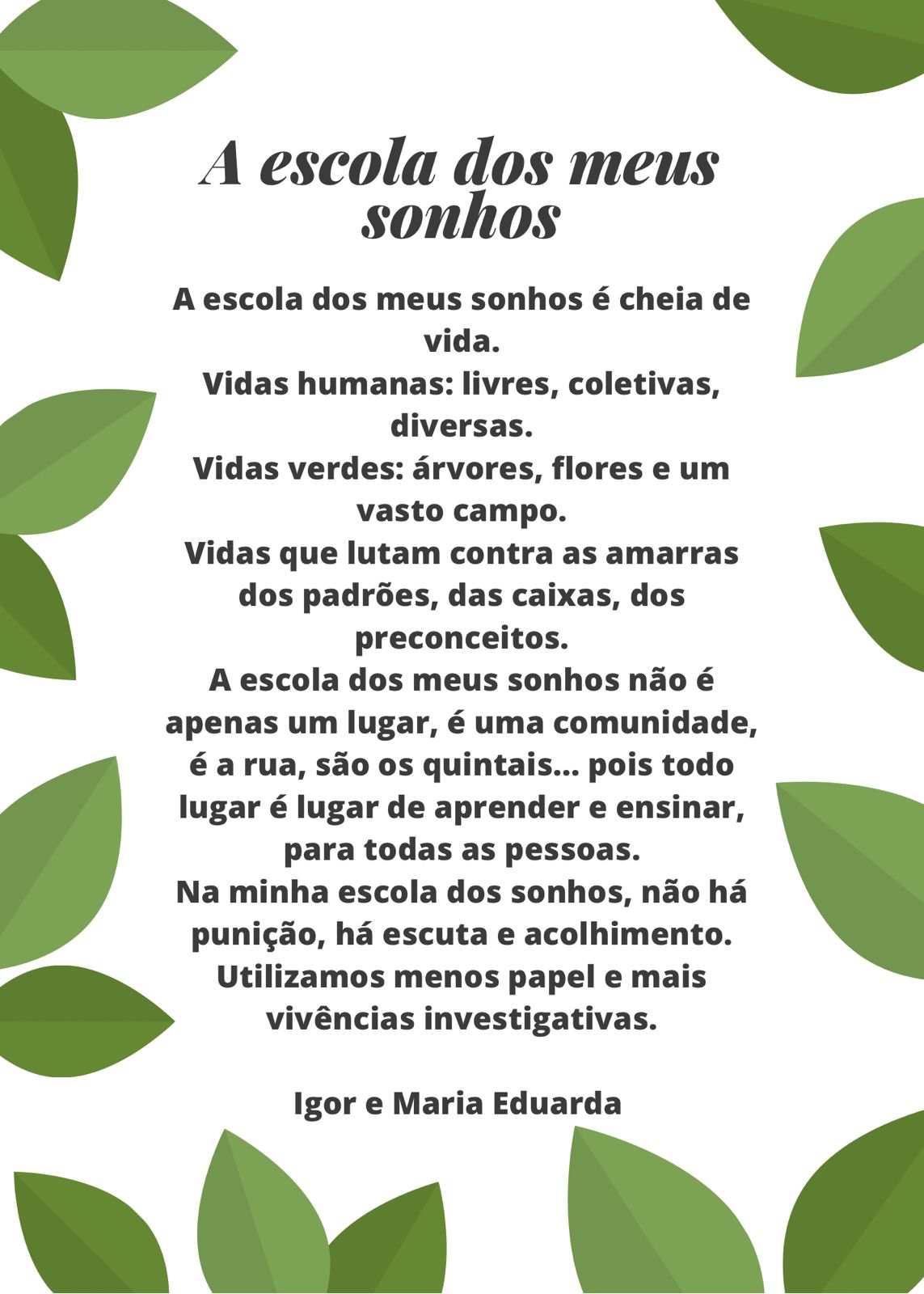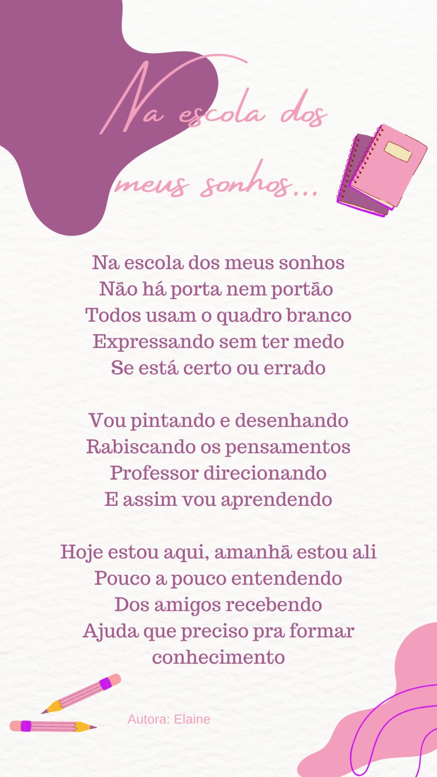 Cultivar sonhos, é inerente ao educador. e imaginação é essencial. Para tanto, na disciplina de Supervisão Educacional, estudamos alguns textos de Rubem Alves sobre a escola da Ponte. Nossos estudantes de pedagogia recentemente mergulharam nessa ideia, criando poesias sobre a "Escola dos Sonhos".