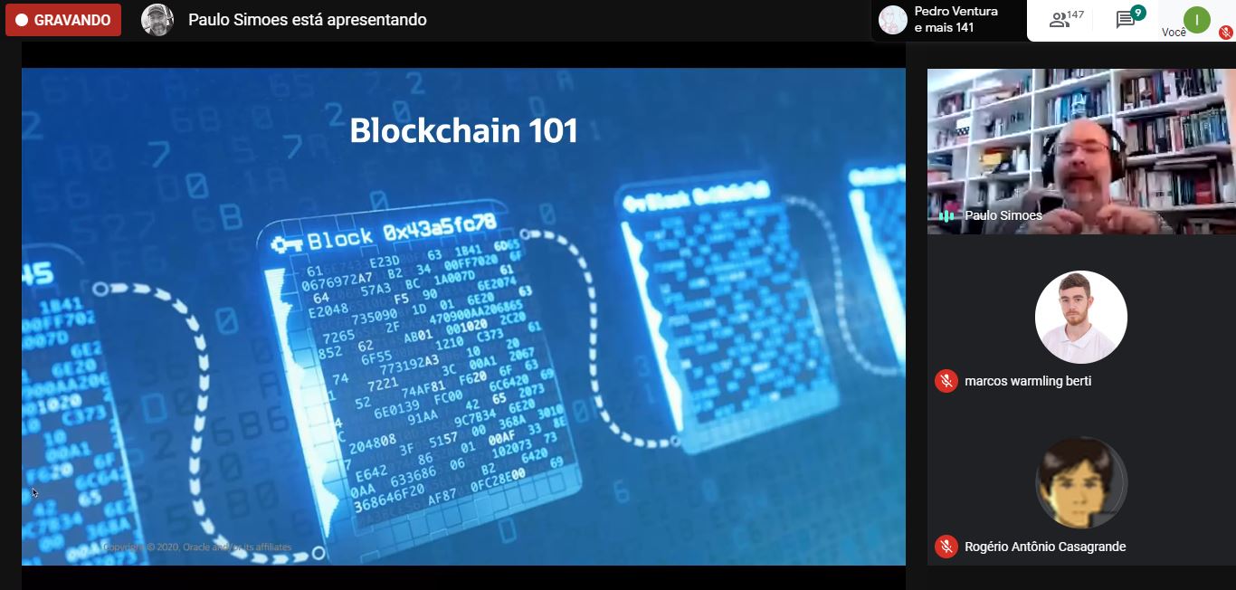 Capaz de relacionar o chamado Blockchain, com a Covid-19 e o registro nacional de vacinação de crianças e adultos, o especialista em tecnologia Paulo Alberto Simões promoveu uma noite de muito compartilhamento de conhecimento entre acadêmicos e professores do curso de Ciência da Computação da Unesc. Em evento virtual nesta terça-feira (26/5), Paulo tratou sobre a temática “Blockchain – uma tecnologia chave para a grande transformação digital da sociedade”. O evento contou com a participação da reitora da Universidade, Luciane Bisognin Ceretta, e da coordenadora do curso, Ana Claudia Garcia Barbosa, assim como de professores da Universidade e foi mediado pelo coordenador adjunto Luciano Antunes.