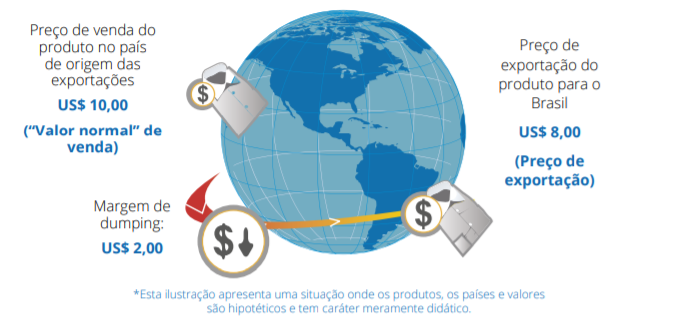 As medidas antidumping, um instrumento de defesa comercial, caracterizam-se como uma proteção da indústria doméstica, aplicadas quando um determinado país exporta seus produtos a um preço inferior aquele comercializado no seu mercado interno (veja ilustração). Vale ressaltar, que as medidas antidumping somente serão aplicadas caso a indústria doméstica sofra prejuízos provocados por tal prática.