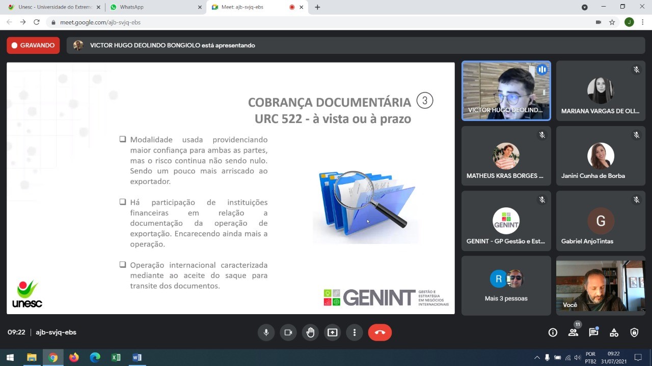 Na manhã do último sábado (31.07.2021), a temática do PRIME Class envolveu “Modalidades de Pagamento Internacional” e foi ministrada por Victor Hugo Bongiolo, acadêmico do Curso de Administração-Comércio Exterior da UNESC. Bongiolo faz parte do Grupo de Pesquisa Gestão e Estratégia em Negócios Internacionais - GENINT/UNESC e também é bolsista do Programa de Imersão Empresarial - PRIME .