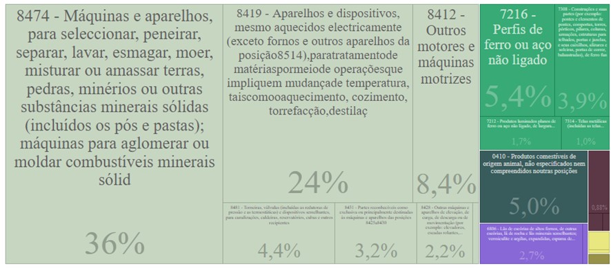 Em primeiro lugar representando 36% do total de exportação do município está o setor HS 8474 (Maquinas e aparelhos, para selecionar/ peneirar), seguido pelo HS 8419 (Aparelhos e dispositivos) com 24% e com 8,4% encontra-se o HS 8412 (Outros motores e maquinas).