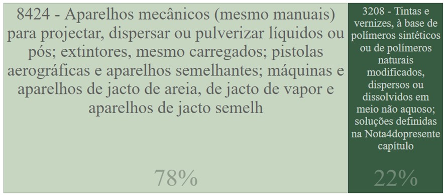 E na importação, quem lidera de forma isolada é o HS 8424 (Aparelhos mecânicos para projetar) com 78%, seguido pelo HS 3208 (Tintas e vernizes) que completam nosso ranking.