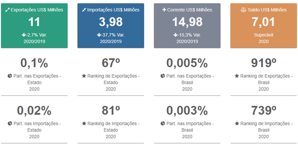 Em 2020 as exportações do município totalizaram US$ 11 milhões e as importações US$ 3,98 milhões. Quando comparadas com o ano anterior, as exportações tiveram um recuo de 2,7% e as importações também tiveram um recuo, porém mais considerável de 37,7%. A corrente de comércio finalizou em US$ 14,98 milhões, representando um recuo de 15,3% em relação a 2019 e o saldo comercial fechou em superávit de US$ 7,01 milhões.