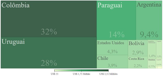 Em 2020, a Colômbia foi a maior parceira comercial do município, representando 32% do total de exportações, seguida pelo Uruguai com 28%, em terceiro lugar se encontra o Paraguai com 14%, e fechando o nosso top 4, encontra-se a Argentina com 9,4%.