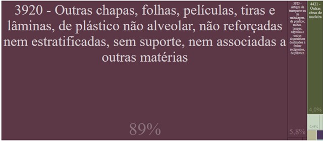 Em primeiro lugar representando mais da metade do montante total das exportações do município com 89% está o setor HS 3920 (Outras chapas, folhas, películas), seguido pelo HS 3923 (Artigos de transportes ou de embalagem) com 5,8%.