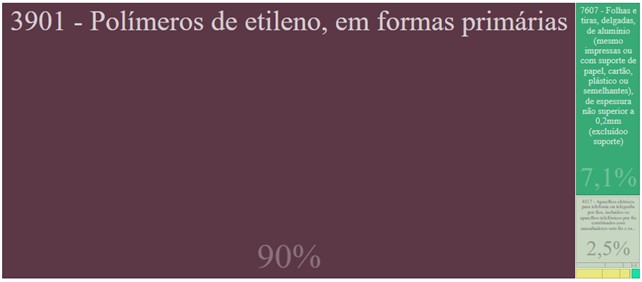 E na importação, quem lidera de forma isolada é o HS 3901 (Polímetros de etileno) com 90%, seguido pelo HS 7607 (Folhas e tiras, delgadas, de alumínio) com 7,1% completam nosso ranking.