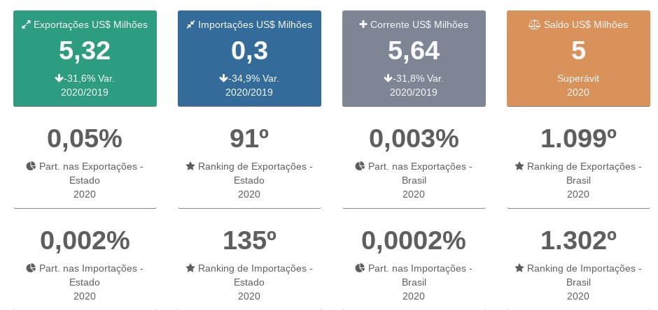 Em 2020 as exportações do município totalizaram US$ 5,32 milhões e as importações US$ 0,3 milhões. Quando comparadas com o ano anterior, as exportações tiveram um recuo significativo de 31,6% e as importações também tiveram um recuo considerável de 34,9%. A corrente de comércio finalizou em US$ 5,64 milhões, representando um recuo de 31,8% em relação a 2019 e o saldo comercial fechou em superávit de US$ 5 milhões.