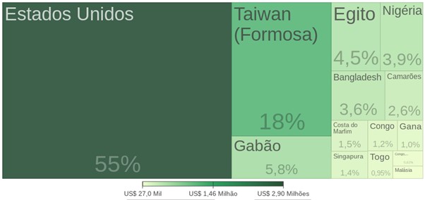 Em 2020, Estados Unidos foi de forma isolada possuindo mais da metade do montante total o maior parceiro comercial de Laguna, representando 55% do total de exportações, seguido por Taiwan com 18%, em terceiro lugar se encontra o Gabão com 5,8%, e fechando o nosso top 4, encontra-se o Egito com 4,5%.