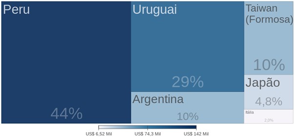 Na importação, o maior parceiro comercial do município foi o Peru com 44% do montante total, seguido pelo Uruguai com 29%, em terceiro lugar encontra-se a Argentina e Taiwan com 10% e fechando nosso ranking aparece o Japão com 4,8%.