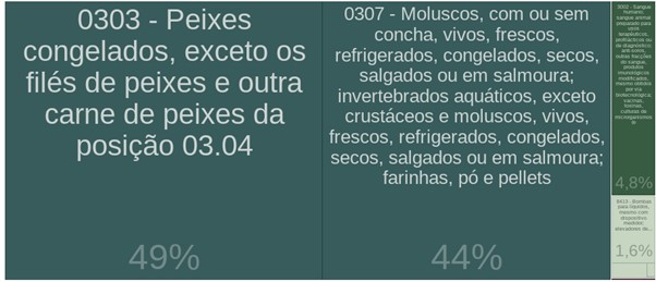 Em primeiro lugar, com grande participação no montante total das exportações do município com 96% está o setor HS 0303 (Peixes congelados), seguido pelo HS 2301 (Farinha) com 3,6%.