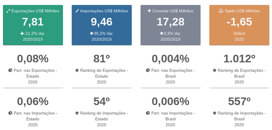 Em 2020 as exportações do município totalizaram US$ 7,81 milhões e as importações US$ 9,46 milhões. Quando comparadas com o ano anterior, as exportações tiveram um recuo de 21,2% e as importações um acréscimo de 39,2%. A corrente de comércio finalizou em US$ 17,28 milhões, representando um pequeno aumento de 3,3% em relação a 2019 e o saldo comercial fechou em déficit de US$ 1,65 milhões.