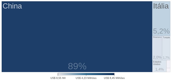 Na importação, o maior parceiro comercial do município é a China com 89% do montante total, seguido pela Itália com 5,2%, em terceiro lugar encontra-se a Dinamarca com 2% e fechando nosso ranking aparece a Turquia com 1,7%.