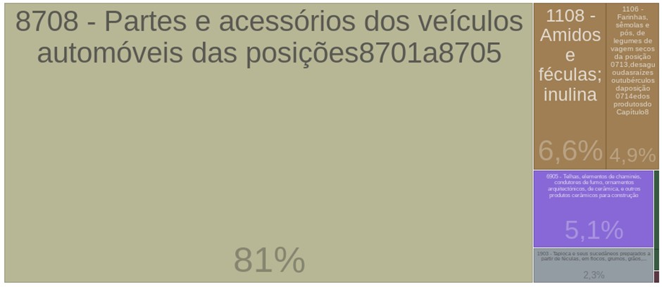 Em primeiro lugar representando mais da metade do montante total das exportações do município com 81% está o setor HS 8708 (Partes e acessórios dos veículos automóveis), seguido pelo HS 1108 (Amidos e féculas) com 6,6%, fechando o top 3 está o HS 6905 (Telhas) com 5,1%.