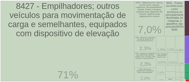 E na importação, quem lidera de forma isolada é o HS 8427 (Empilhadores) com 71%, seguido pelo HS 8452 (Máquinas de costura) com 7,0% completando nosso ranking.
