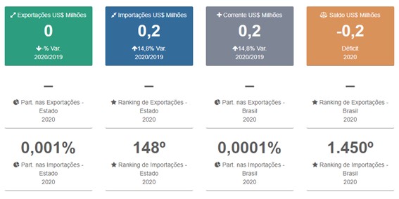 No ano de 2020, a cidade importou e teve uma corrente de US$ 163.033 com uma variação de 14,8% de ambos os quesitos em relação ao ano anterior, como o município não exportou ele apresentou um déficit de - US$ 163.033 em seu saldo.
