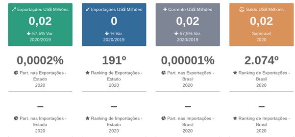 Em 2020 as exportações do município totalizaram US$ 0,02 milhões e não tiveram importações. Quando comparadas com o ano anterior, as exportações tiveram um recuo de 57,5%. A corrente de comércio finalizou em US$ 0,02 milhões, representando um recuo de 57,5% em relação a 2019 e o saldo comercial fechou em superávit de US$ 0,02 milhões.